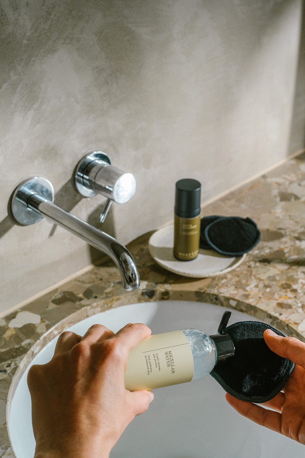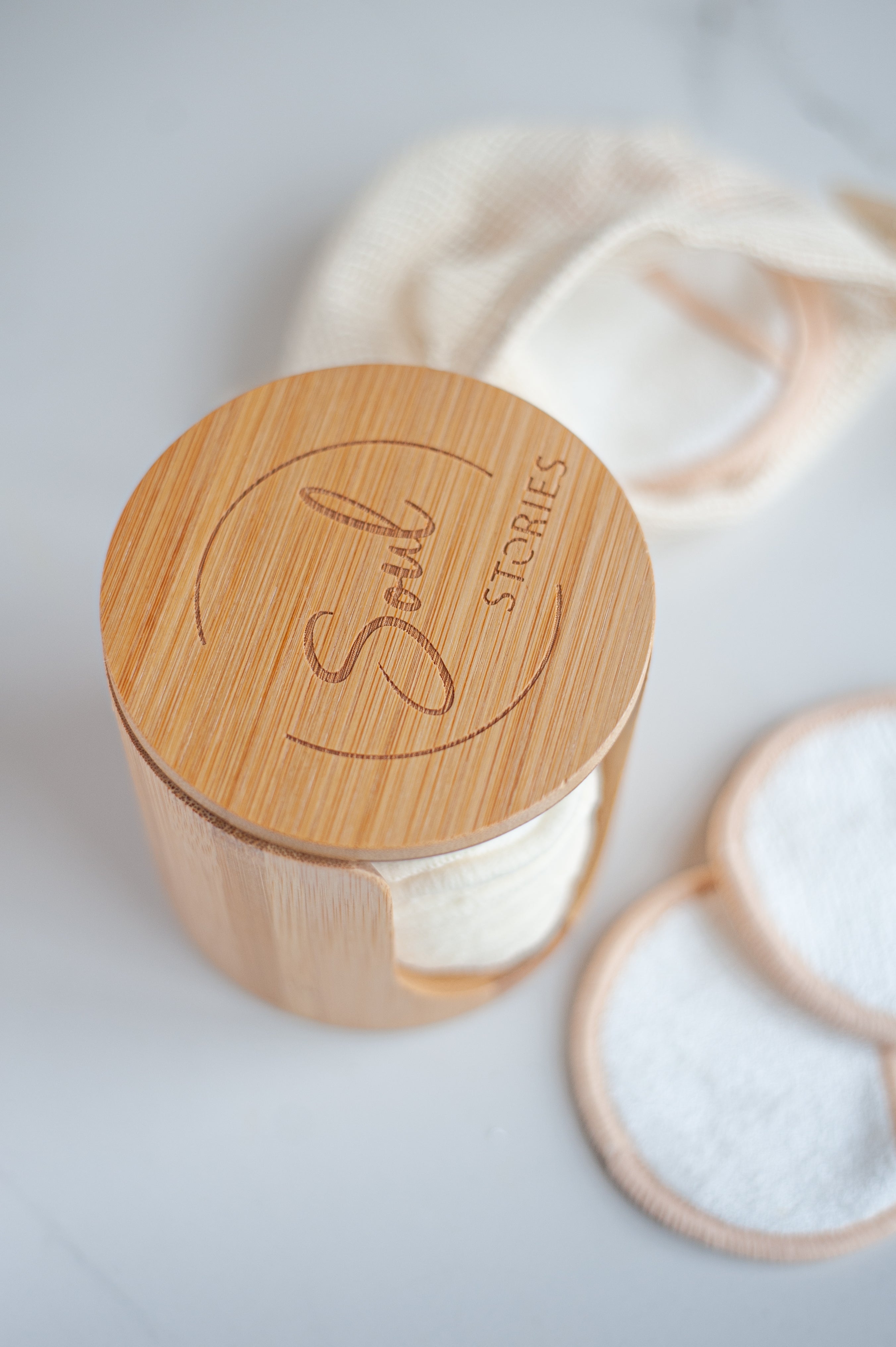 This set includes our micellar water + reusable cotton pads in a beautiful bamboo holder.